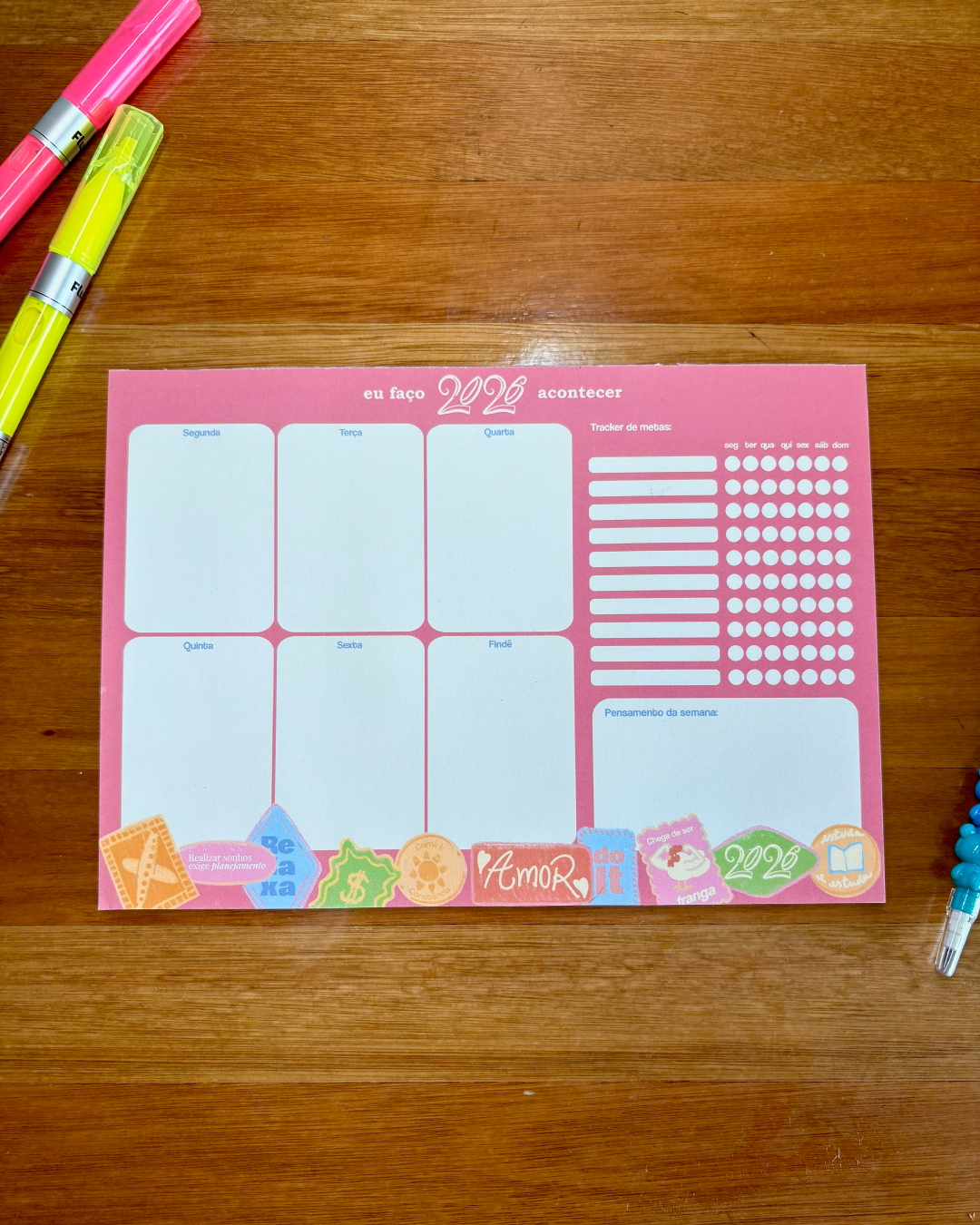 Chegaram os seus planners favoritos! E esses são pra quem quer que 2026 seja o melhor ano de todos! Com planejador semanal, tracker de metas e espaço para refletir sobre seus pensamentos da semana, o planner "Faço acontecer" te ajuda a planejar, contabilizar e atingir suas metas para 2026. Tá na hora de realizar seus sonhos ★